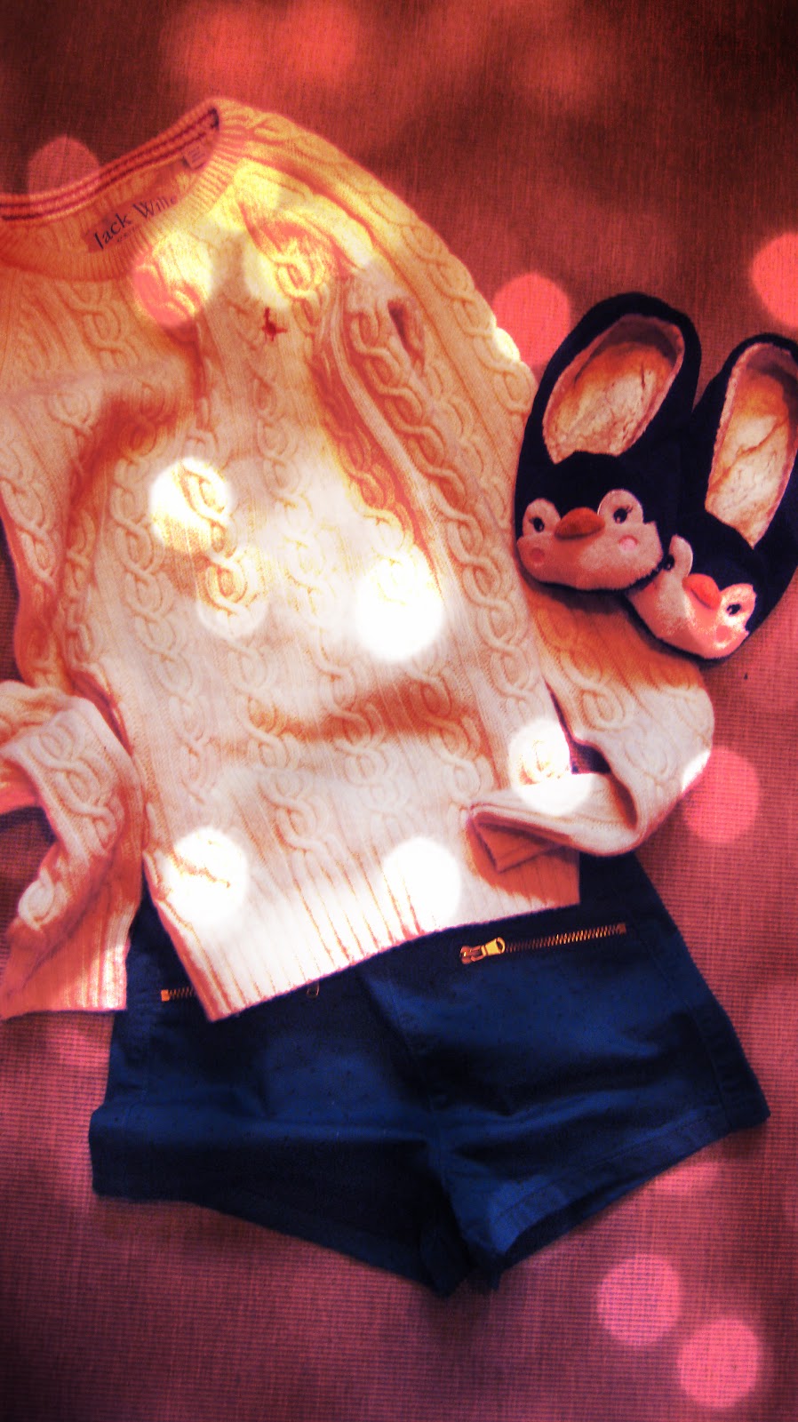 green shorts with cosy jumper and really cute slippers